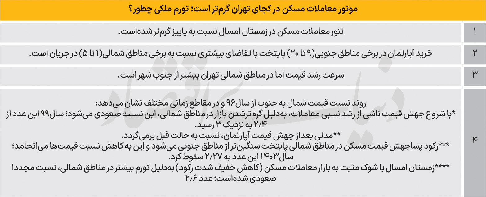 تحلیل تحولات بازار مسکن طی هشت سالگذشته از زمستان ۱۳۹۶ تاکنون نشان میدهد این بازار سه شوک مهم اقتصادی- سیاسی را پشتسر گذاشتهاست. نخستین شوک در سال۱۳۹۷ و همزمان با جهش تورمی در اقتصاد و آغاز عصر جهش قیمت مسکن رخ داد. دومین شوک در سالهای اخیر و بهویژه از ۱۴۰۳ تا نیمه امسال تحتتاثیر تنشهای سیاسی و ریسکهای ناشی از جنگ و نااطمینانیهای اقتصادی شکلگرفت که رکود سنگینی را به بازار تحمیل کرد. سومین شوک نیز در زمستان امسال و بهویژه در بهمنماه بهصورت یک شوک مثبت معاملاتی ظاهر شد؛ به این معنا که شدت رکود تا حدودی کاهشیافت و بازگشت نسبی خریداران به بازار، زمینه افزایش قیمت در برخی مناطق را فراهم کرد. بررسیها حاکی است، نسبت قیمت آپارتمانهای شمال به جنوب تهران تحتتاثیر تورم ملکی در مناطق ۲۲گانه تهران، تحتتاثیر الگوی معناداری حرکت میکند.