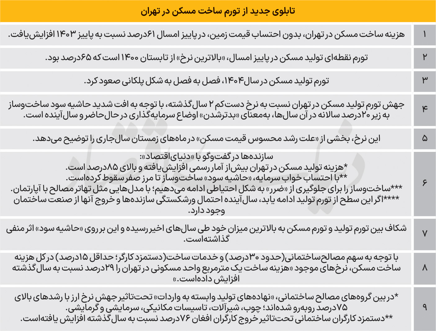 بهای تولید مسکن در تهران بیش از ۶۱درصد نسبت به سال گذشته افزایش پیدا کرده که «بیشترین تورم ساختمانی» از تابستان ۱۴۰۰ است. آمار رسمی از رشد قیمت مصالح‌ساختمانی و دستمزد کارگران این بخش نشان می‌دهد، سطح تورم نقطه‌ای طی ۳فصل سال جاری، مرتب صعودی بوده‌است. در فصل پاییز، قیمت آن دسته از نهاده‌های تولید ساختمان که «وارداتی» هستند یا تولید داخلی آنها به مواد اولیه وابستگی بالایی دارد، بین ۷۵ تا ۹۷درصد جهش پیدا کرد. این زلزله ارزی، حاشیه سود تولید مسکن را به لبه ورشکستگی شرکت‌ها نزدیک کرده است.