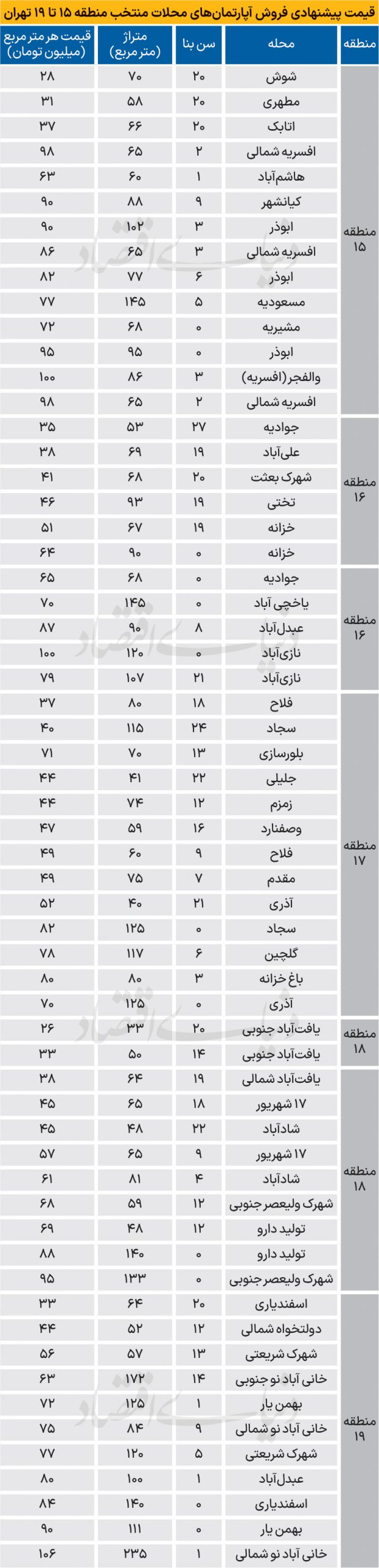 متوسط قیمت پیشنهادی خانه در تمامی محلات منطقه ۱۵ تا ۱۹ تهران در مهر ۵۹میلیون تومان بود؛ این رقم از رصد تمامی دادههای پیشنهادی برای فروش در بازار آنلاین حاصل شده و تفکیکی در زمینه سن بنا، متراژ، محله، برخورداری از امکاناتی نظیر آسانسور، پارکینگ و… که هر یک میتواند بر قیمت پیشنهادی نهایی اثرگذار باشد، انجام نشده است. در جدول این گزارش، منتخبی از مشخصات آپارتمانهای عرضه شده برای فروش در بازار آنلاین از محلات منتخب منطقه ۱۵ تا ۲۰ تهران ارائه شده است. در بازه مورد بررسی کف قیمت آپارتمان مربوط به محله یافتآباد جنوبی در منطقه ۱۸ است که خانهای با سن بنای ۲۰ سال به مساحت ۳۳ مترمربع با قیمت هر مترمربع ۲۶میلیون تومان عرضه شده است. بنابراین کف بودجه مورد نیاز برای خرید یک سوئیت قدیمی ۳۳ متری در جنوب تهران به ۸۶۰میلیون تومان میرسد.