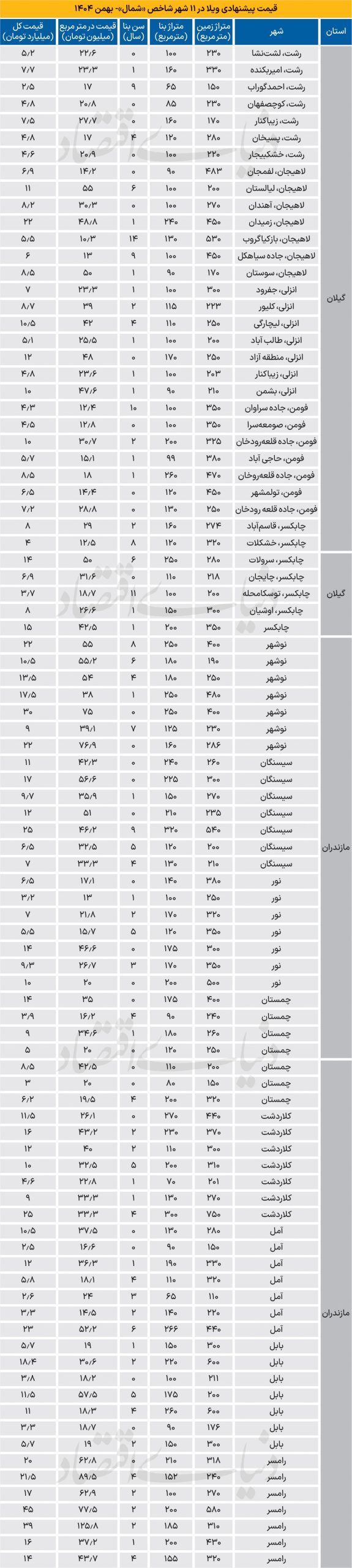 در حالحاضر میانگین قیمت پیشنهادی هر مترمربع ویلا در دو استان گیلان و مازندران به ۳۴٫۲میلیون تومان رسیده؛ درحالیکه این رقم در سالگذشته حدود ۲۱میلیون تومان بودهاست.شاخص نسبت قیمت مسکن در تهران به قیمت ویلا در شمال که گروه مسکن «دنیایاقتصاد» از ابتدای دهه۹۰ آن را محاسبه میکند، اکنون به عدد ۳٫۵ رسیدهاست. این شاخص طی دو سالگذشته بهدلیل نزدیکشدن سطح قیمت آپارتمان و ویلا کاهشیافته بود؛ درحالیکه در دورههای جهش مسکن تهران، این نسبت به بالای ۵ نیز میرسد. اما بازار زمین بهرغم افزایش تقاضا، جهش حدود ۹درصدی را تجربه کرد و برخلاف بازار ویلا، فروش زمین در گیلان رشد ۱۶درصدی را تجربه کرد و متوسط قیمت هر مترمربع زمین در گیلان به ۹٫۹ میلیون تومان رسید و در مازندران با رشد ۶ درصدی به ۱۱٫۷ میلیون تومان به ازای هر متر مربع رسید.