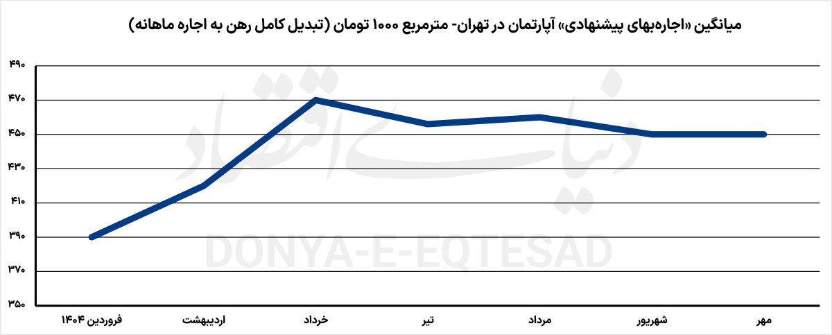 تفاوت رشد اجارهبهای تهران در مقایسه با نرخ کشوری، چهره دومی از تورم اجاره را به تصویر کشید. بازار اجاره مسکن پایتخت، در مهرماه روند معکوسی را در مقایسه با تورم اجاره کشوری در پیش گرفت، بهطوریکه تورم ماهانه اجاره در آن «صفر» شد در حالیکه در بازار کشوری به ۳درصد افزایش یافت. شاخص اجاره مسکن «دنیای اقتصاد» در ابتدای آبان ۱۴۰۴، نشان میدهد، میانگین «اجارهبهای پیشنهادی» واحدهای مسکونی در محلههای منتخب مناطق ۲۲گانه تهران در مهر ماه، با تبدیل کامل پول پیش به اجاره ماهانه، مانند شهریور، ۴۵۰هزار تومان در هر مترمربع بوده است.