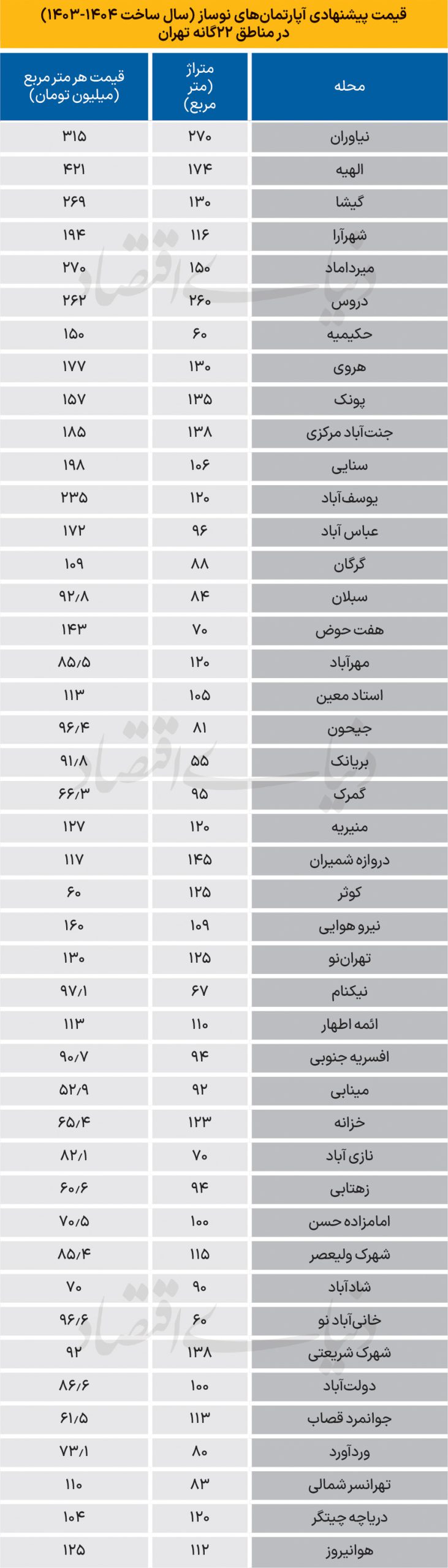 میانگین قیمت پیشنهادی آپارتمانهای کلیه مناطق ۲۲گانه تهران براساس «شاخص قیمت پیشنهادی» طی ماهجاری ۱۰۸میلیونتومان در هر مترمربع است. بررسیها از فایلهای موجود در بازار نشان میدهد، سهم واحدهای مسکونی نوساز از کل آپارتمانهای ارائهشده به بازار ۱۸درصد است. نکته قابلتوجه در بررسی آپارتمانهای نوساز طی یک ماه اخیر نشان میدهد، قیمت پیشنهادی آپارتمانهای نوساز ساخت ۱۴۰۴ ارائهشده به بازار توسط عرضهکنندگان، در مقایسه با آپارتمانهای نوساز ساخت ۱۴۰۳، «کمتر» است. میانگین قیمت پیشنهادی برای آپارتمانهای نوساز ساخت۱۴۰۴ در بازار ۱۵۱.۲میلیون تومان در مترمربع است؛ درحالیکه این رقم برای آپارتمانهای نوساز ساخت۱۴۰۳، رقم ۱۵۶میلیون تومان در مترمربع است؛ این در حالی است که تعداد آپارتمانهای ساخت ۱۴۰۴ از حجم بالاتری در مقایسه با سال۱۴۰۳ برخوردار است و حدود ۶۸درصد از آپارتمانهای نوساز در بازار برای سال۱۴۰۴ و ۳۲درصد از آن به سال۱۴۰۳ اختصاص دارد. تحقیقات میدانی «دنیایاقتصاد» همچنین نشان میدهد، بیشترین حجم آپارتمانهای نوساز در بازار به مناطق شمالی تهران اختصاص دارد و ۵منطقه شمالی پایتخت در مقایسه با دیگر مناطق، نیمی از آپارتمانهای نوساز ارائهشده به بازار توسط عرضهکنندگان را به خود اختصاص دادهاند و منطقه ۱۹ با عرضه ۱۱ آپارتمان نوساز در ۲۵ آذر به بازار، کمترین میزان آپارتمانهای نوساز را به خود اختصاص دادهاست.