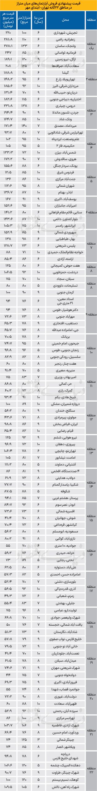 قیمت فروش آپارتمانهای میان متراژ در مناطق ۲۲گانه تهران
