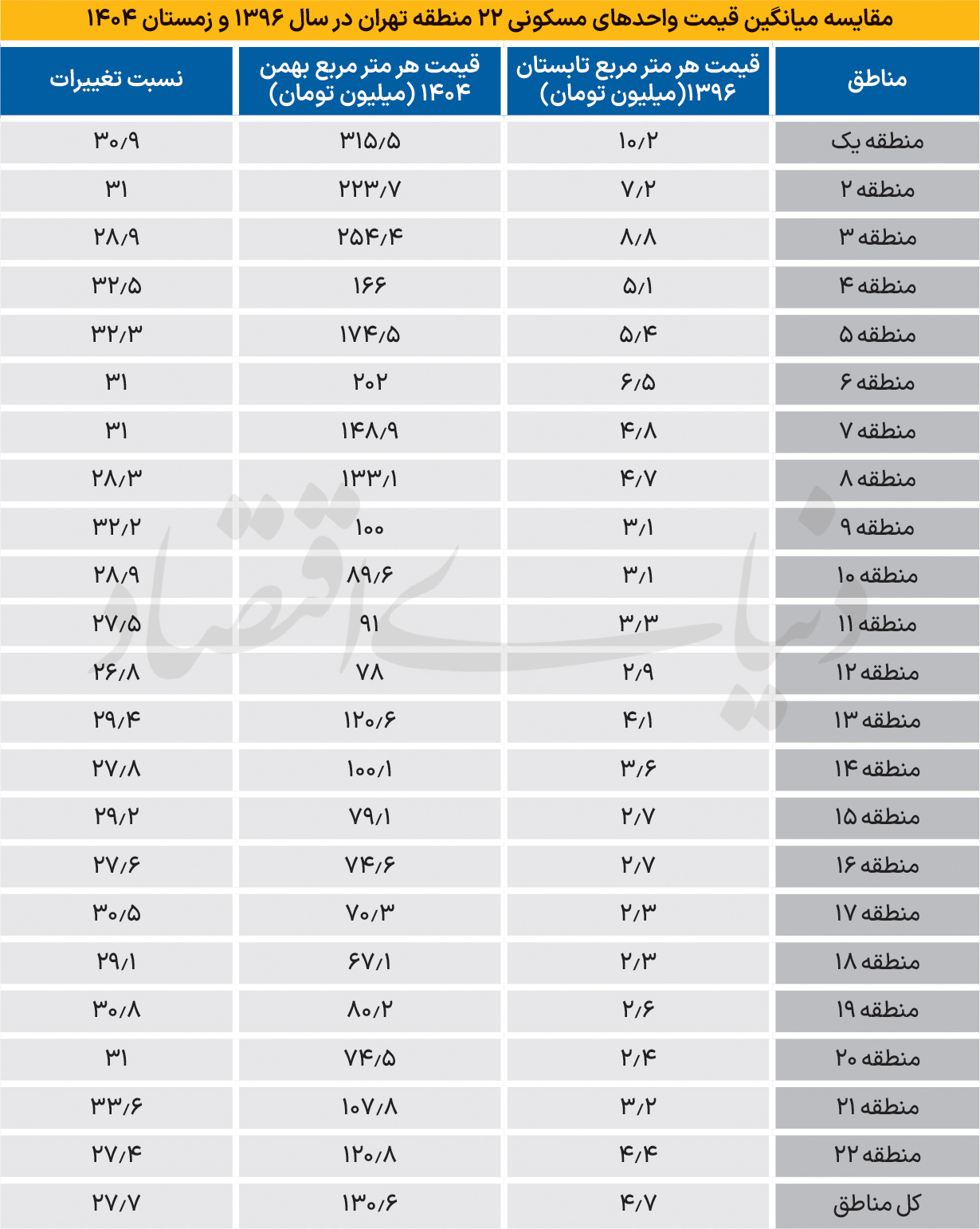 مقایسه میانگین قیمت آپارتمان۲۲ منطقه تهران در سال ۱۳۹۶ و زمستان ۱۴۰۴