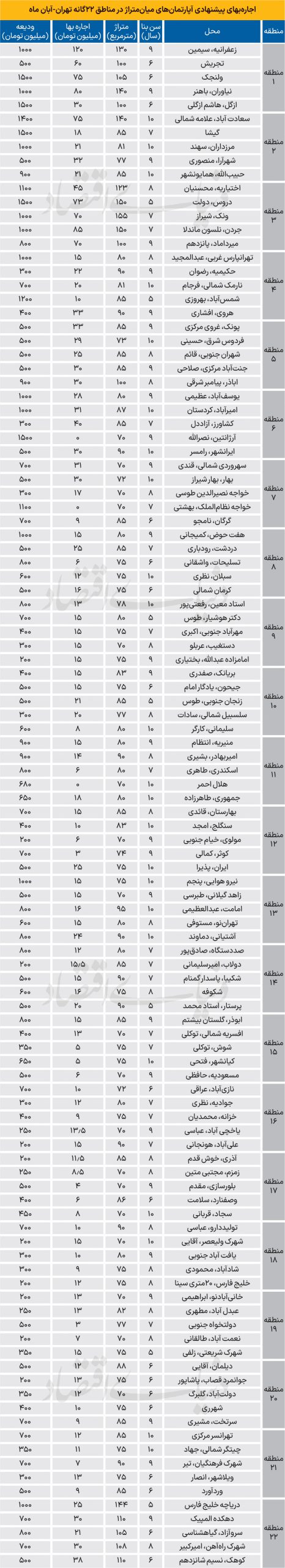هزینه اجاره آپارتمان میانمتراژ در مناطق ۲۲گانه تهران