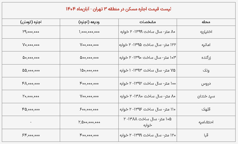 هزینه اجاره خانه در منطقه ۳ تهران چقدر است؟