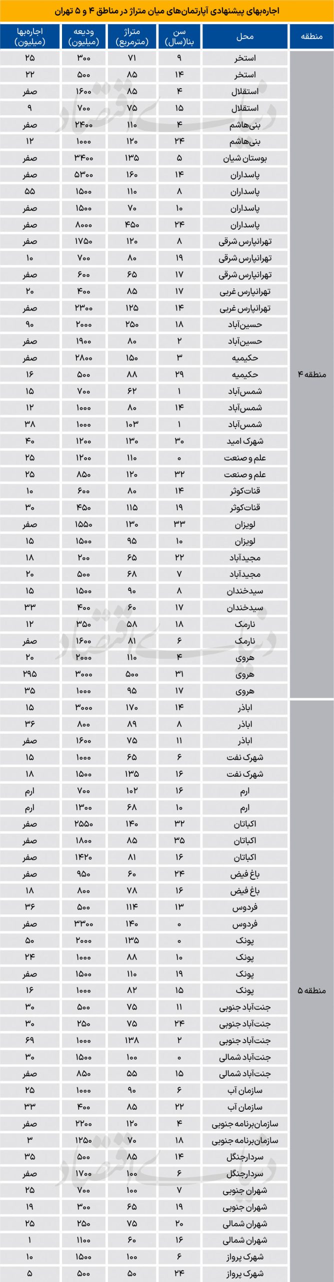 ودیعه و اجاره در مناطق ۴ و ۵