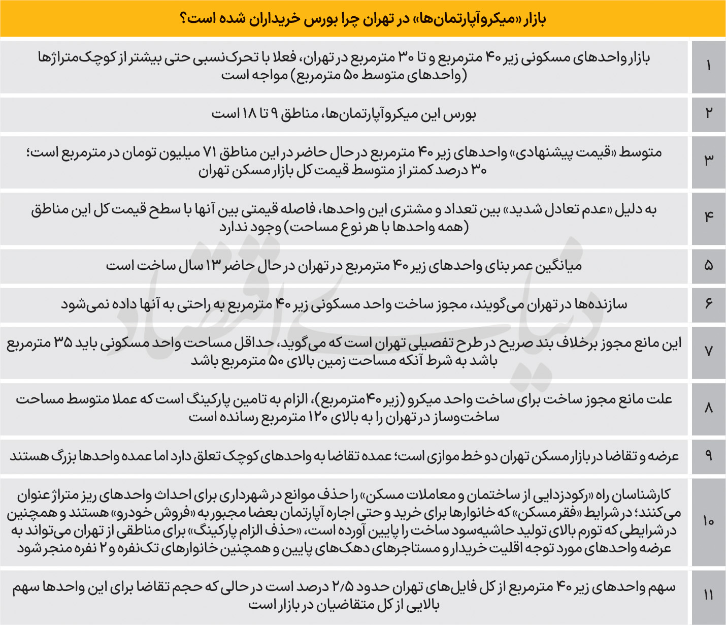 همچنین، براساس روایت فعالان در بازار ساختمان، محدودیتی قانونی برای ساخت واحدهای زیر ۵۰ متر وجود ندارد و سند تکبرگ مانند دیگر واحدهای مسکونی به آنها تعلق میگیرد. در واحدهای نوساز نیز یا سند آماده بود یا مراحل ثبت سند در حال انجام بود. اگرچه اجازه ساخت مجتمعهای ریزمتراژ ۲۰ متری بهطور مستقل داده نمیشود، اما در آپارتمانهای ۳ تا ۴ طبقه یا مجتمعهایی که انواع متراژها را شامل میشوند، امکان ساخت چند واحد زیر ۵۰ متر نیز وجود دارد و محدودیت قانونی برای آنها لحاظ نشده است. این عوامل باعث میشود واحدهای ریزمتراژ زیر ۴۰ متر در بازار کمیاب باشند و این کمبود عرضه، در کنار تقاضای بالا، ارزش آنها را افزایش دهد. بررسیها نشان میدهد، عرضه و تقاضا در بازار مسکن تهران دو خط موازی است؛ عمده تقاضا به واحدهای کوچک تعلق دارد اما عمده واحدها بزرگ هستند، در حال حاضر عمده سازندگان به دلیل همین محدودیتها تمایل خود را به ساخت واحدهای بالای ۱۰۰مترمربع معطوف کردهاند، درحالیکه تقاضای واقعی بازار به سمت متراژهای پایینتر حرکت کرده است.