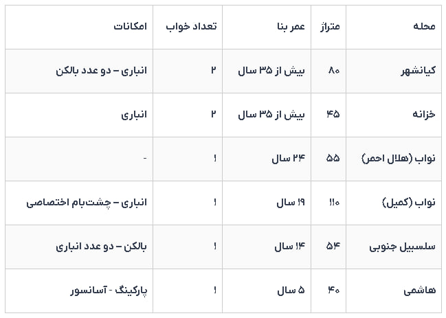 مچنین در محدوده نواب نیز گزینه‌هایی با رهن کامل ۵۰۰ میلیون تومان وجود دارد؛ واحد ۵۵ متری در هلال احمر با ۲۴ سال عمر بنا و بدون امکانات خاص و همچنین آپارتمان ۱۱۰ متری در کمیل با ۱۹ سال سن، انباری و پشت‌بام اختصاصی.