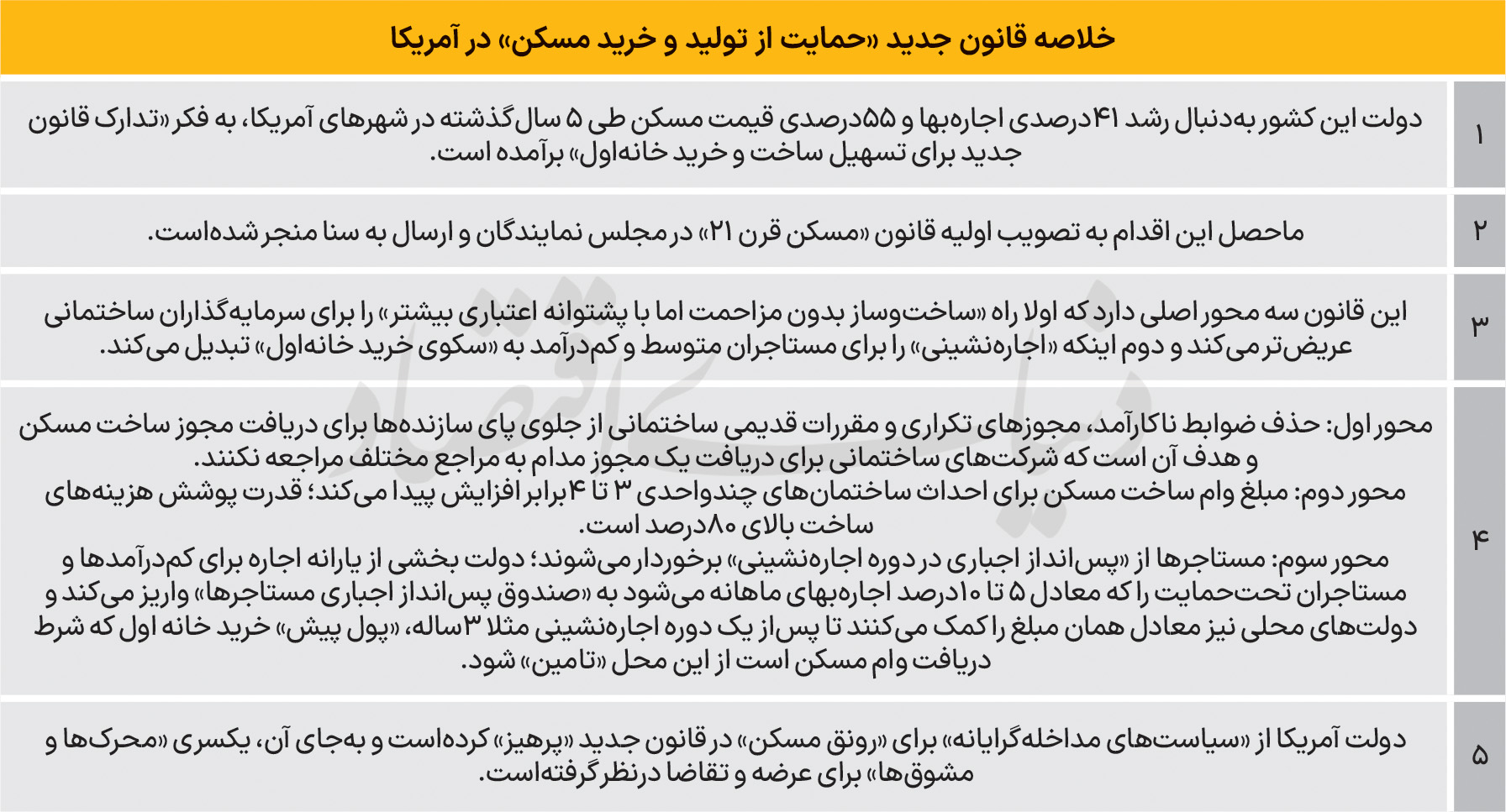 براساس گزارشی از واشنگتنتایمز، قانون موسوم به «مسکن قرن بیستویکم» با اکثریت قاطع ۳۹۰ رای موافق دربرابر تنها ۹ رای مخالف از سد پارلمان گذشت. در این میان، تنها یک نماینده از حزب دموکرات و هشت نماینده از حزب جمهوریخواه با این لایحه مخالفت کردند. این مصوبه دربرگیرنده حدود ۲۵ تدبیر راهبردی است که از آن جمله میتوان به سادهسازی فرآیندهای قانونی، نوسازی برنامههای دولت مرکزی در حوزه مسکن، گسترش شیوههای تامین مالی و تقویت نظارت بر ارائهدهندگان خدمات مسکن اشاره کرد.